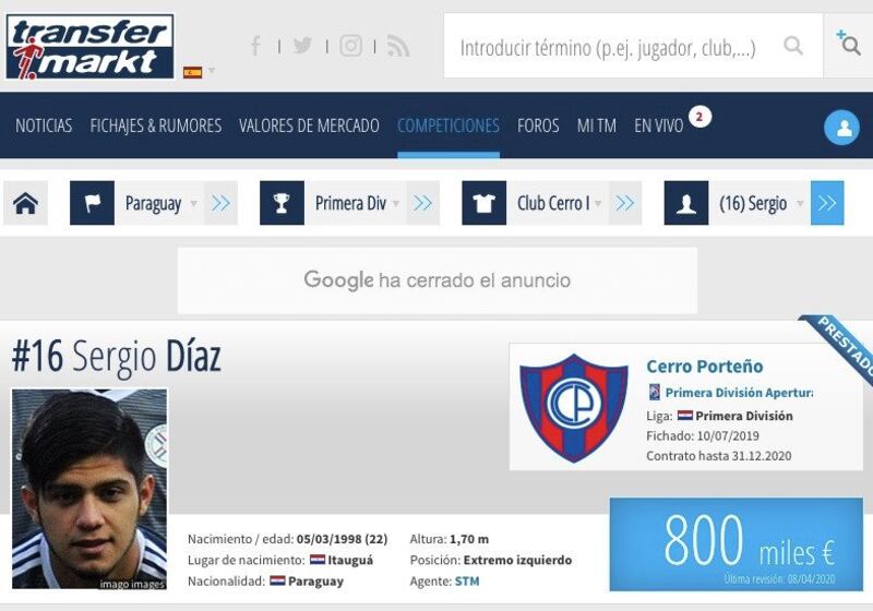 El Real Madrid había fichado en el 2016 a Sergio Díaz a cambio de 5 millones de euros, según se supo en su momento, pero lo que llama la atención es que su valor de mercado actual es seis veces menor, según el portal especializado Transfermarket, que cifra su ficha en 800 mil euros.