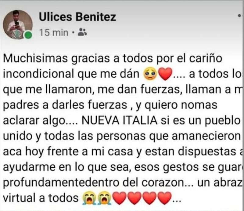 Tras el gesto, Ulises les dio las gracias a todos y además posteó fotos en su Facebook, donde también dedicó unas palabras: “Muchísimas gracias a todos por el cariño incondicional que me dan... a todos los que me llamaron, me dan fuerzas. Nueva Italia sí es un pueblo unido. Estos gestos se guardan profundo en el corazón’’, publicó el joven muy emocionado.