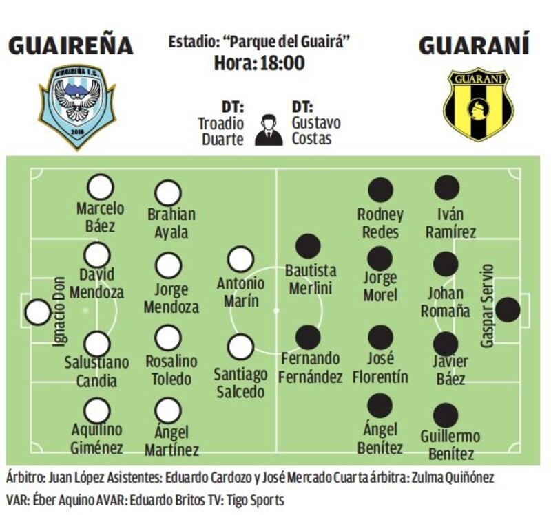 Por el lado de Guaraní, el equipo también tiene sus propios akãrasy, ya que el argentino Gustavo Costas no podrá contar con dos piezas importantes, del mediocampo para arriba, ellos son Édgar Benítez y de Raúl Bobadilla. El tranque tiene todos los condimentos para que sea un partidazo, ya que además de todo lo mencionado, al Aborigen y a los gua’i les separa un solo punto de diferencia, en el 5.º y 6.º puestos, respectivamente.