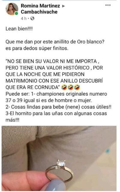 Romina publicó la foto de un anillo de compromiso y tecleó: “¿Qué me dan por este anillito de oro blanco? Es para dedos superfinitos. No sé bien su valor ni me importa, pero tiene un valor histórico porque la noche que me pidieron matrimonio con ese anillo descubrí que era re-cornuda”.