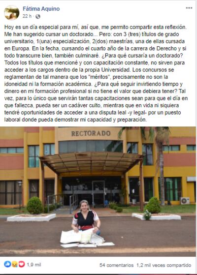 “Hoy es un día especial para mí, así que, me permito compartir esta reflexión”, dicen las primeras líneas, para luego relatar que pese a todos los estudios por los que ya pasó le “sugirieron” jey hacer un doctorado ndaje. Es ahí donde ella cuestiona si cómo, “con 3 títulos de grado universitario, 1 de especialización, 2 de maestrías (una de ellas cursada en Europa) y en la fecha cursando el cuarto año de la carrera de Derecho" no le sirvieron para acceder a un cargo dentro de la Universidad.