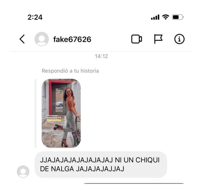 Todo empezó con una foto que la cronista publicó en su cuenta de Instagram y donde aparecía de perfil. Un seguidor que evidentemente usaba una cuenta falsa le escribió a la comunicadora: “Ni un chiqui de nalga tenes, ja..ja..”