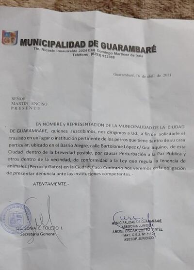 “En nombre y representación de la Municipalidad de la Ciudad de Guarambaré, quienes suscribimos, nos dirigimos a Ud., a fin de solicitarle traslado en un lugar o institución pertinente de los perros que tiene dentro de su casa particular (…), dentro de la brevedad posible, por causar perturbación a la paz pública y otros dentro de la vecindad”, dice en parte la nota enviada a la familia Enciso y que está firmada por el asesor jurídico de la Muni.