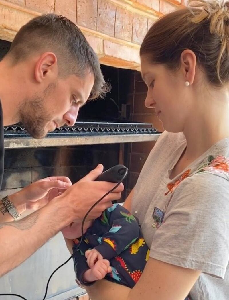 La mamá terminó ayudando en la sesión de peluquería y dejaron a su bebé bien peladito.