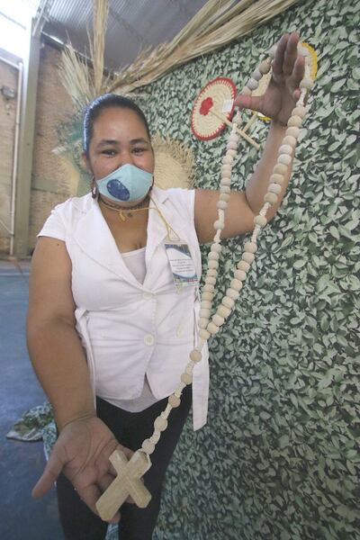 Una de las obras de arte de don Claudio es el rosario hecho de piedra, el cual es totalmente tallado a mano y tiene un tiempo de elaboración de aproximadamente un mes.