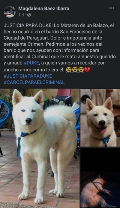 Ocurrió el martes por la tarde en la Ciudad de Paraguarí. Su dueña publicó en su cuenta de Facebook, con tristeza y dolor lo que había pasado, su mascota fue asesinada de un disparo y lamentablemente, aún no saben quién fue el desalmado.