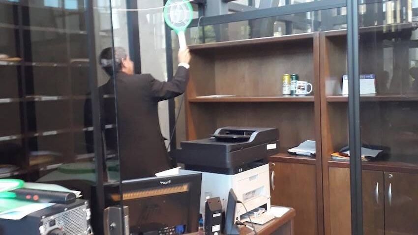 La abogada y periodista de Universo 970 AM captó el momento en que un funcionario se las ingenia con una de esas paletas que hacen “chispear” a los insectos tratando de matar la mayor cantidad de mosquitos posibles dentro de diferentes dependencias, pero por sobre todo, en las cercanías al acceso principal. Es que más allá del aire acondicionado o el veneno que se tira, estos zancudos parecen haber encontrado como un “hogar alternativo” en las oficinas del Legislativo.