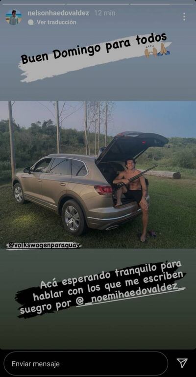 El ídolo posó en su camioneta, con una escopeta en la mano y con una fuerte advertencia para los simpáticos. ¿Por qué? Por lo visto, loperro se pasan diciéndole suegro, por su hija Noemi Haedo, lo que obviamente molestó al León Guaraní. Claro, todo en buena onda hína nomás como siempre suele hacer sus historias.