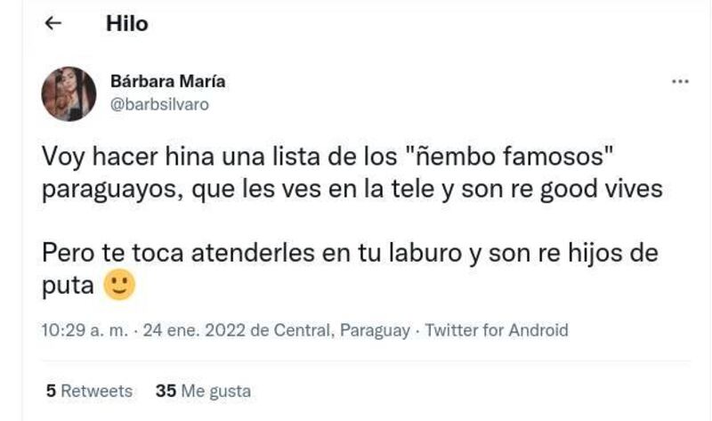 "Voy hacer hina una lista de los 'ñembo famosos' paraguayos, que les ves en la tele y son re good bives Pero te toca atenderles en tu laburo y son re hijos de...", anunció.
