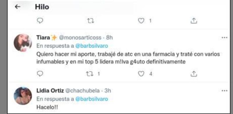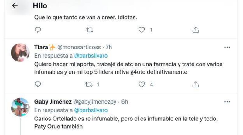 "Quiero hacer mi aporte, trabajé de atención en una farmacia y traté con varios infumables y en mi top 5 lidera m!lva g4uto definitivamente", escribió Tiara (@monosarticoss). Gaby Jimenez (@gabyjimenezpy) aportó también y mandó al frente a Carlitos Ortellado.