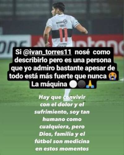 "Hay que convivir con el dolor y el sufrimiento, soy tan humano como cualquiera, pero Dios, familia, amigos y el fútbol son medicina en estos momentos", fue lo que lanzó en su history del Instagram, respondiendo al mensaje de una seguidora que mencionó: "Iván Torres no sé cómo describirlo, pero es una persona que yo admiro bastante, a pesar de todo está más fuerte que nunca. La Máquina".