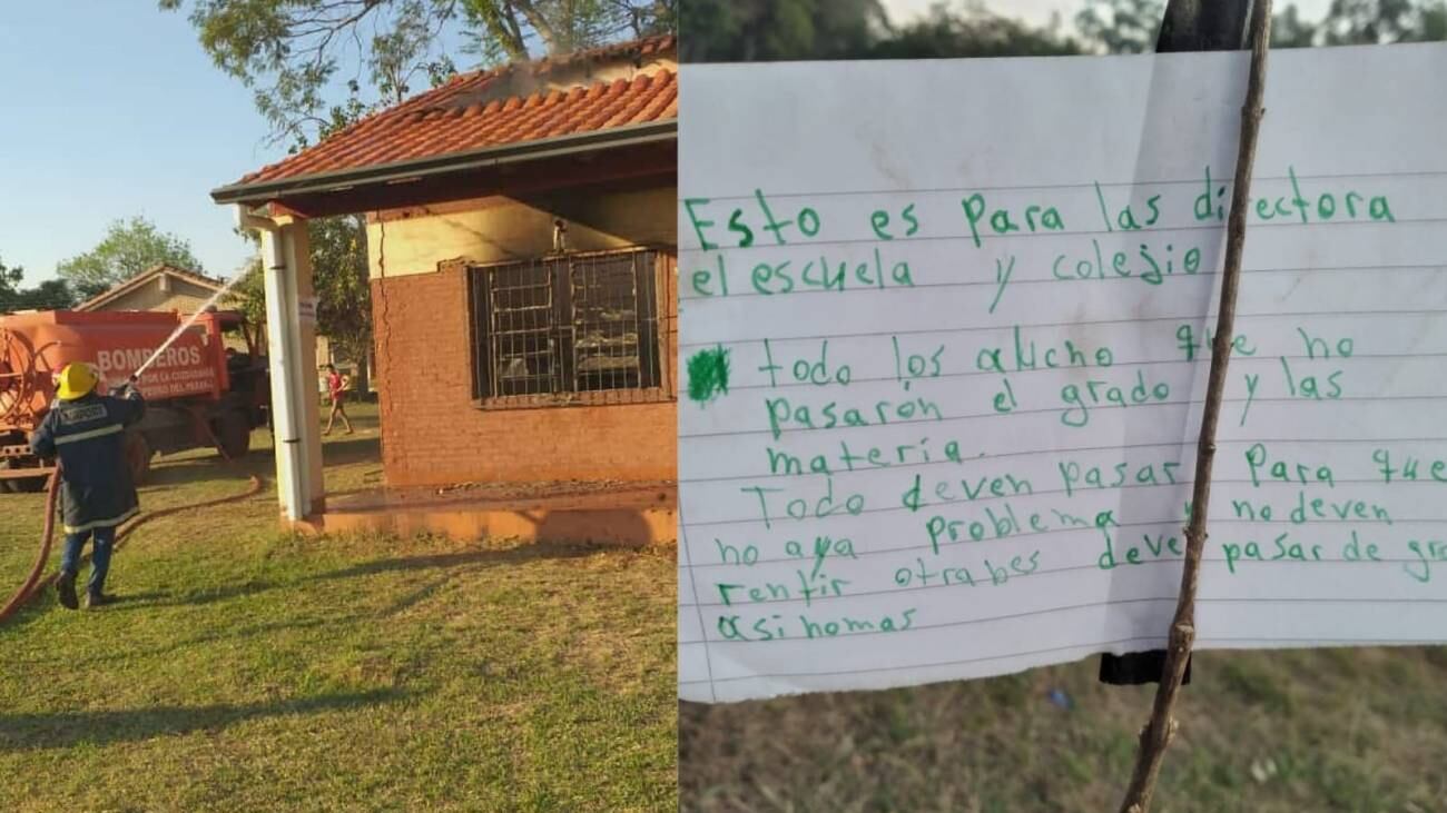 Las aulas del Colegio y Escuela Básica Nro. 2049 María Auxiliadora del distrito de San Pedro del Paraná se quemaron por completo luego de que unos estudiantes le prendan fuego, los mismos hasta dejaron una nota advirtiendo a la directora que tiene que hacer pasar a todos los alumnos que repitieron ndajeko.