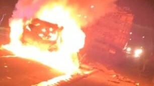 Un enorme camión que transportaba leña y un auto fueron los protagonistas del percance. Al chocar contra el camión, el auto ardió en llamas, mientras que el chofer del camión salió ileso, el conductor del auto, un hombre de 56 años falleció en el lugar.