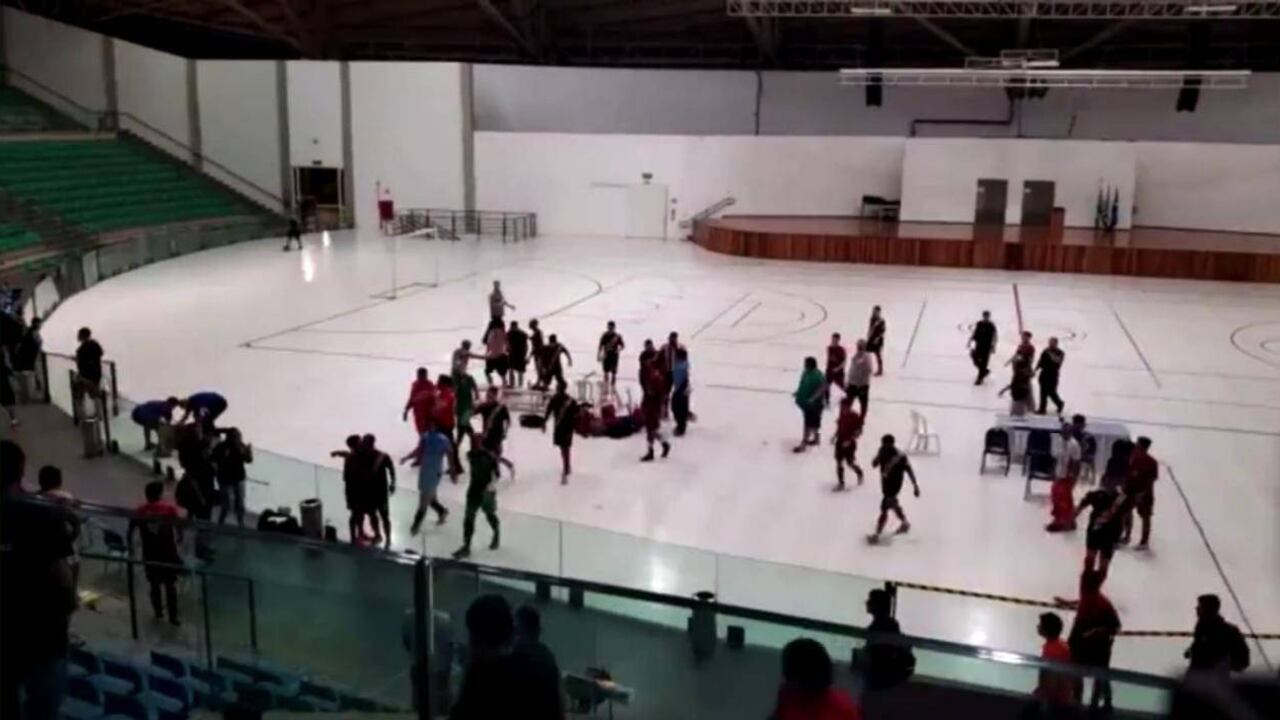 𝐒𝐄𝐌𝐈𝐅𝐈𝐍𝐀𝐋 𝐒𝐔𝐒𝐏𝐄𝐍𝐃𝐈𝐃𝐀 En los escritorios, en un rato, se definirá la semifinal entre Colorado 🇧🇷 y Simón Bolívar 🇵🇾 A falta de 10 segundos a raíz del jugador brasileño se desató una batalla campal que aún continúa afuera pic.twitter.com/KF6BwWdefJ — Nicolás De León (@NicoDeLeonOrue) April 8, 2022