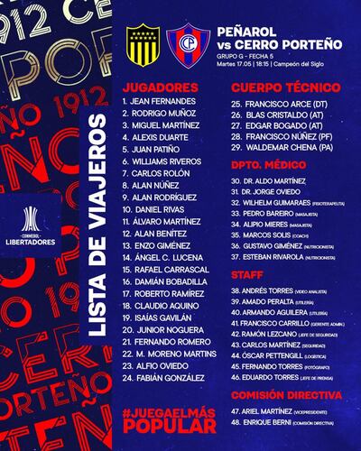 Algunos no están al 100% físicamente, pero “Chiqui” tomó la decisión de llevarlo y son éstos: Jean Fernandes, Rodrigo Muñoz, Miguel Martínez, Alexis Duarte, Juan Patiño, Williams Riveros, Carlos Rolón, Alan Núñez, Alan Rodríguez, Daniel Rivas, Álvaro Martínez, Alan Benítez, Enzo Giménez, Angel Cardozo Lucena, Rafael Carrascal, Damián Bobadilla, Roberto Ramírez, Claudio Aquino, Isaias Gavilán, Junior Noguera, Fernando Romero, Marcelo Moreno Martins, Alfio Oviedo y Fabian González.