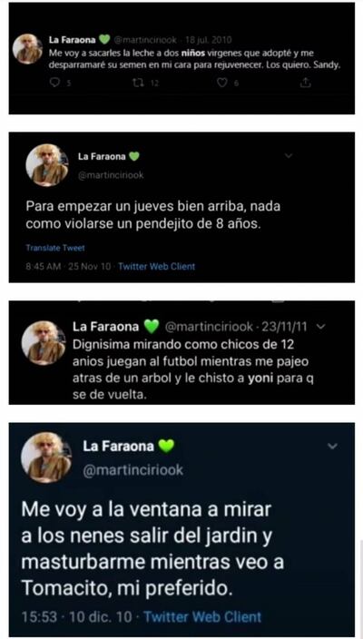 En la denuncia penal que presentaron contra él en Argentina hace dos años, citan estas frases escritas por el actor en sus redes: “Hoy es un buen día para violar un pendejo”, “Desvirginaré a un pendejito limpiaparabrisas”, entre otras.