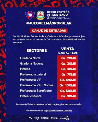 Gradería norte y novena G. 20.000, plateas G. 30.000, preferencia lateral G. 70.000, preferencia Vip no socios G. 120.000, preferencia Vip socios G. 100.000.