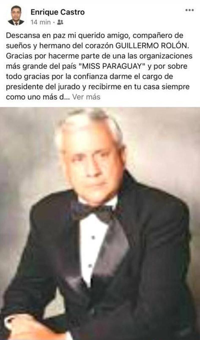 “Descansa en paz mi querido amigo, compañero de sueños y hermano del corazón Guillermo Rolón”, escribió Enrique Castro quien últimamente venía siendo el presidente del jurado de Miss Paraguay.