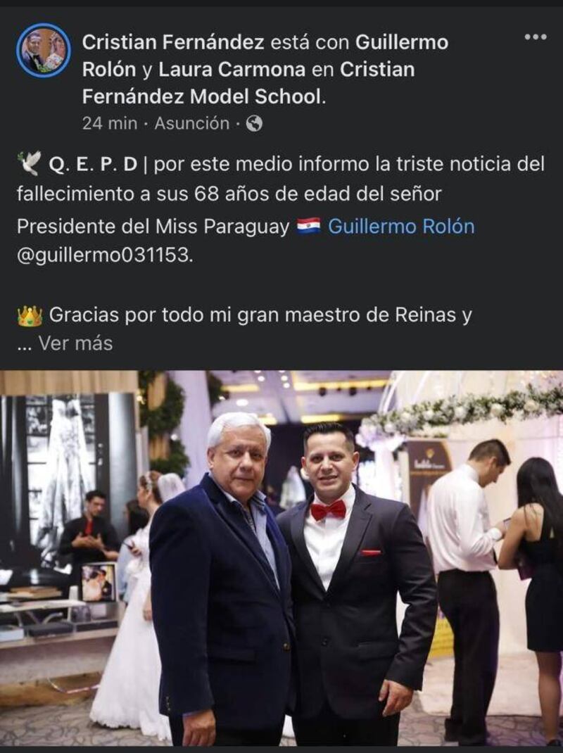 “Por este medio informo la triste noticia de fallecimiento a sus 68 años de edad del señor presidente de Miss Paraguay, Guillermo Rolón. Gracias por todo mi gran maestro”, escribió el preparador de Misses, Cristian Fernández.