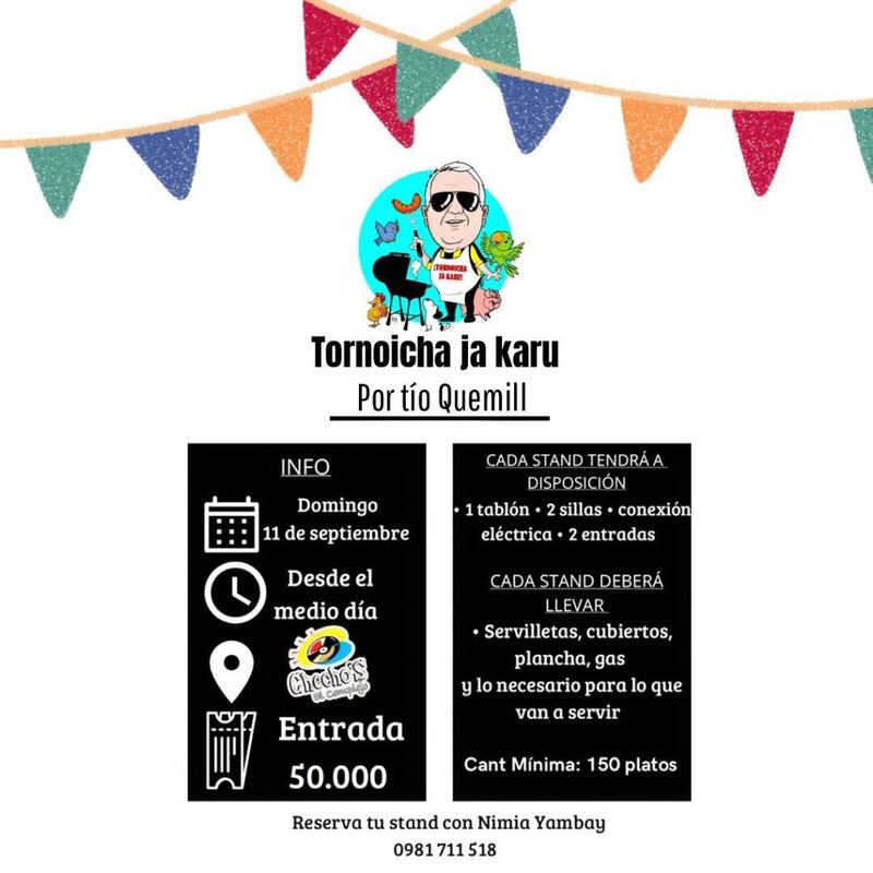 "Tornoicha jakaru por Tío Yambay" se llama una comilona que se organiza el próximo domingo 04 de septiembre en El Complejo Checho's de San Lorenzo donde la entrada costará 50.000 e incluye todos los platos salados que puedan consumir. La organización del evento hizo un llamado a la gente que quiera poner un stand de comida a sumarse a la noble causa comunicándose al 0981711518 para coordinar con doña Nimia Yambay.