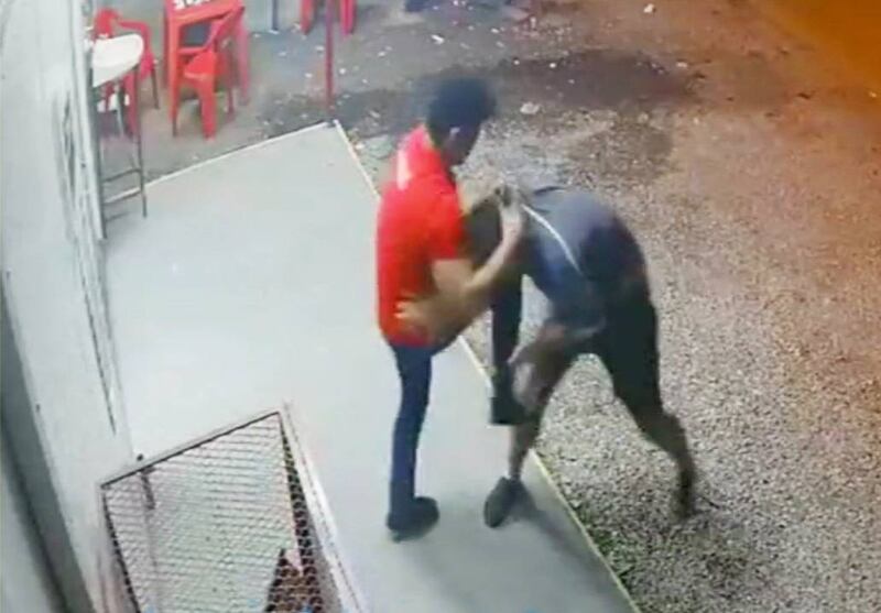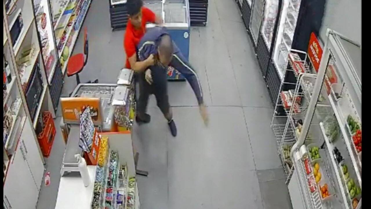 Se puede observar en las imágenes del circuito cerrado, que amenazante aprieta al joven trabajador, hasta que éste reacciona y a patadas y moquetes, logra reducirlo.