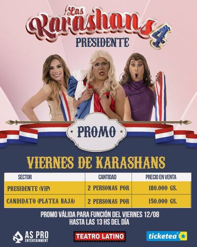 Este finde, la obra vuelve a subir a las tablas y con promociones especiales como: dos entradas al sector Presidente (Vip) por 180 mil guaraníes, o dos entradas al sector Candidato (Platea baja) por 150 mil. Promo válida solamente para de este viernes 12, hasta las 13 horas.