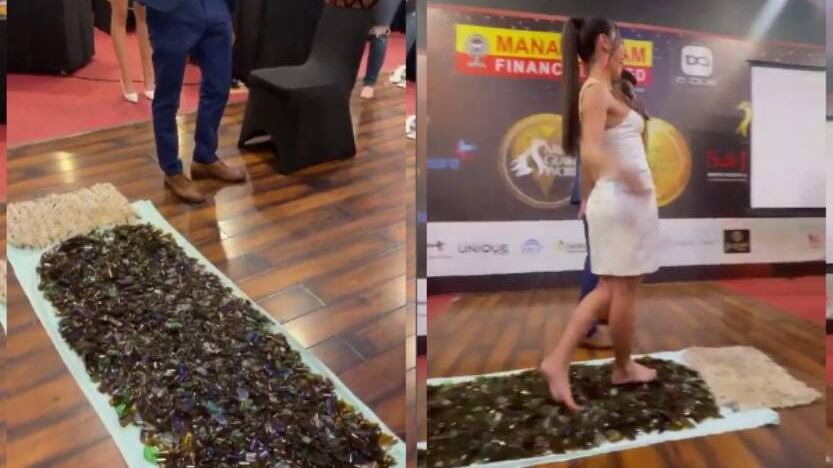 Así fue como Cynthia y las demás candidatas tuvieron que caminar sobre vidrios rotos de botella. La paraguaya hasta hizo poses y todo sobre los elementos cortados. ¡Mirá el momento!