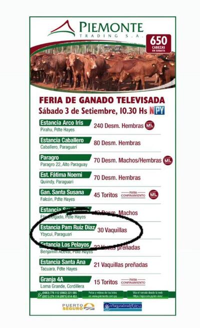 En la lista de establecimientos ganaderos, anunciado por Piemonte, organizador del remate, se puede leer el nombre de Estancia Pam Ruiz Díaz. La modelo contó que el evento, exclusivo para los que se dedican a la ganadería, va a ser televisado.