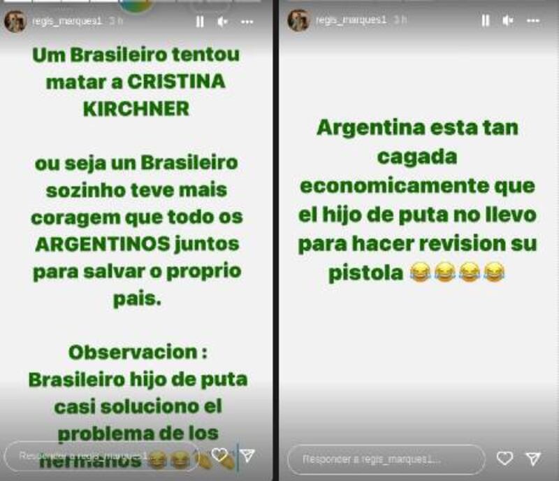 "Un brasilero intentó matar a Cristina Kirchner... o sea que un brasilero solito tuvo más coraje que todos los argentinos para salvar a su propio país", le bajo voi Regis, agregando jey un contundente escrito que decía: "Brasilero hijo de pu... casi solucionó el problema de los argentinos".