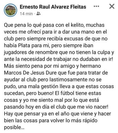 Y por si fuera poco, Álvarez también escribió que se ofreció varias veces para “dar una mano” al club, pero que no le dieron bola. El otro equipo que también bajará a la Primera B es Sportivo Iteño.