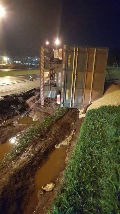 El conductor del vehículo contó que se encontraba estacionado al costado de la referida ruta, a bordo del camión cargado con grano de maíz; sin embargo, por el mal estado de la calzada el vehículo fue deslizándose de a poco hacia abajo, volcando al costado sin poder hacer nada al respecto; del accidente, solo se puede decir que hubieron daños materiales, mientras que Eudes salió ileso del resbalón.