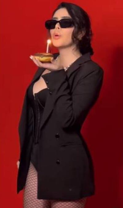A la cureona se la puede ver en una elegante cama, luciendo un largo vestido rojo con un tajo que deja ver sus bellas piernas. La cumpleañera, lleva además una botella de champán en una mano, lanzando un besito, con globlos en el techo y el número "23" pegado a la pared.