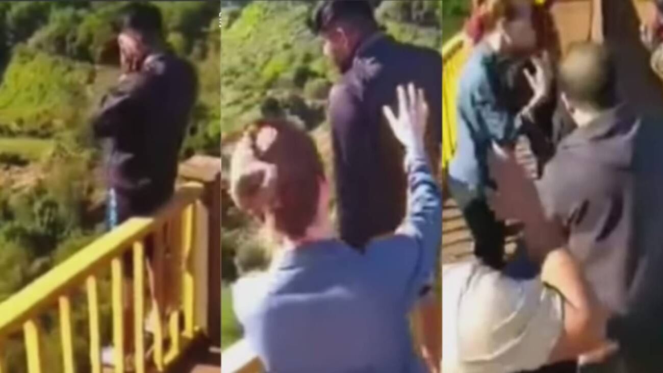 En eso nomás, se le acercó una mujer, aparentemente extraña y tocándole el hombro, le pide que vuelva atrás. Esto fue aprovechado por la mayoría de las personas que se encontraban en el sitio, para agarrarlo y traerlo de vuelta al paseo del puente.