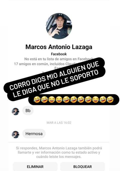 "Corro... Dios mío... Alguien que le haga saber que no le soporto", escribió la amazona acompañando su escrito con unos emojis de "ca... de risa". El tanteo fue a través del buzón de mensajes de Facebook. Lazaga se mostraba muy activo en Instagram, pero hace un tiempito ya, después de muchos escándalos que armó y después de que le "robaran" su cuenta, se creó otra, pero ya se mostró mucho más tranqui.