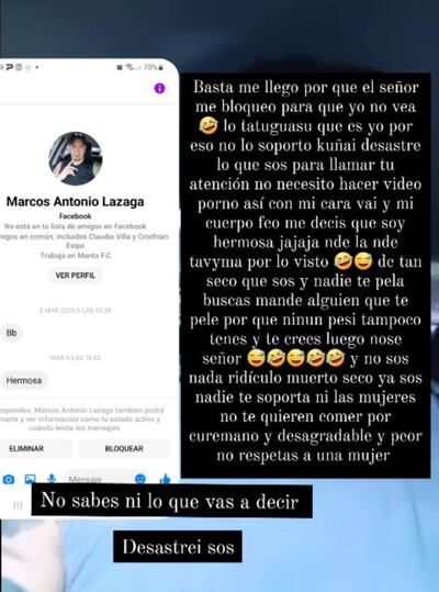 Massa dijo que vio el video que le dedicó Lazaga. "Basta! Me llegó porque el señor me bloqueó para que yo no vea lo tatuguasu que es. Yo por eso no le soporto. Kuña'i, desastre lo que sos", escribió compartiendo el audio del video, donde se le escucha a Lazaga diciéndole que haga video porno si quiere figuretear; además de lo ya mencionado: "fea", "tavy" y "ridícula".