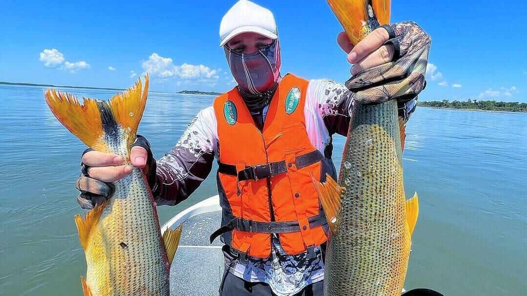 Miguelito Quintana posó orgulloso en su bote, mostrando los dos enormes dorados que pudo pescar. Esta pasión suele compartir también con su hijo, a quien suele llevar a distintos lugares para pescar, compartir juntos un lindo momento.