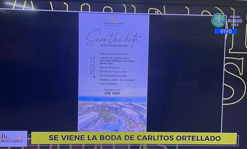 En el programa "Aire de Todos" de Montecarlo FM y GEN/Nación Media mostraron el paquete de viaje por persona en base doble, que costará 1.850 dólares a cada invitado, unos 13.700.000 guaraníes. La estadía durará del 20 al 26 de junio. La boda será en la playa del hotel Grand Palladium.