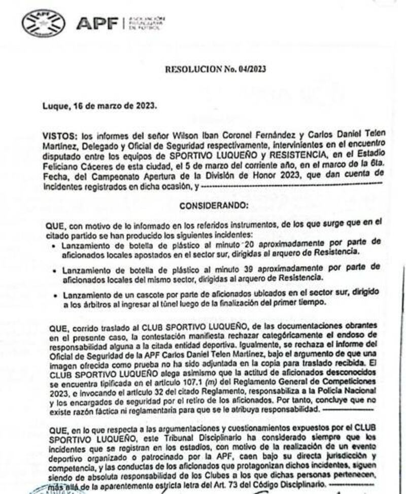 Pero, ¿Qué hicieron los aficionados auriazules? Según el documento emitido por el órgano de la APF encargado de aplicar las sanciones, los barras e hinchas normales lanzaron botellas de plástico al arquero de Resistencia y piedras a los árbitros.