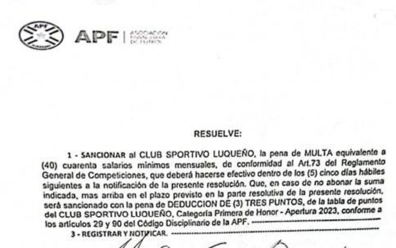 Luqueño tiene 5 días para pagar la multa, contado desde la notificación de la sanción, en caso de no abonar la suma indicada, el equipo de Gustavo Florentìn será sancionado con la pena de deducción de 3 puntos de la tabla de posiciones.