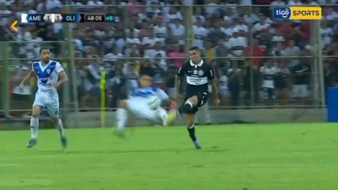 Sin embargo, se nota claramente que el pelotero de Ameliano juega a la pelota (incluso la toca en dos ocasiones), antes de que se dé la caída del pelotero de Olimpia.