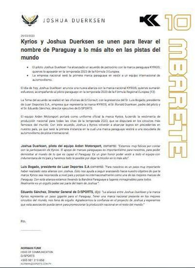 La firma del acuerdo se realizó en las oficinas de D/Consult, con la presencia del Sr. Luis Bogado, Presidente de Luan Deportes S.A., empresa que representa la marca Kyrios, el Sr. Ronald Duerksen, padre del piloto y el Sr. Eduardo Sánchez, Director Ejecutivo de D/SPORTS.