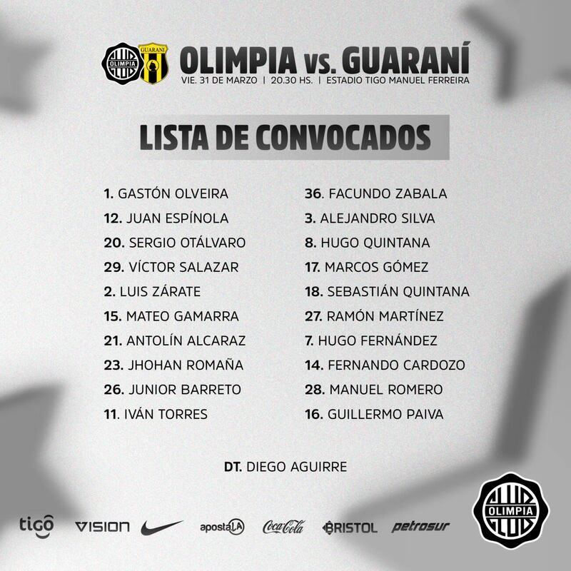 OLIMPIA jugará con: Gastón Olveira; Víctor Salazar, Luis Zárate, Mateo Gamarra y Facundo Zabala; Alejandro Silva, Marcos Gómez, Iván Torres y Hugo Fernández; Fernando Cardozo y Guillermo Paiva.