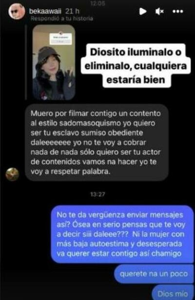 Obviamente, la respuesta de la también influencer no se hizo esperar, y lo hizo a su fiel estilo: "No te da verguenza enviar mensajes así?", empezó escribiéndole al cibernauta. "Ni la mujer con más baja autoestima y desesperada va a querer estar así contigo chamigo", agregó.