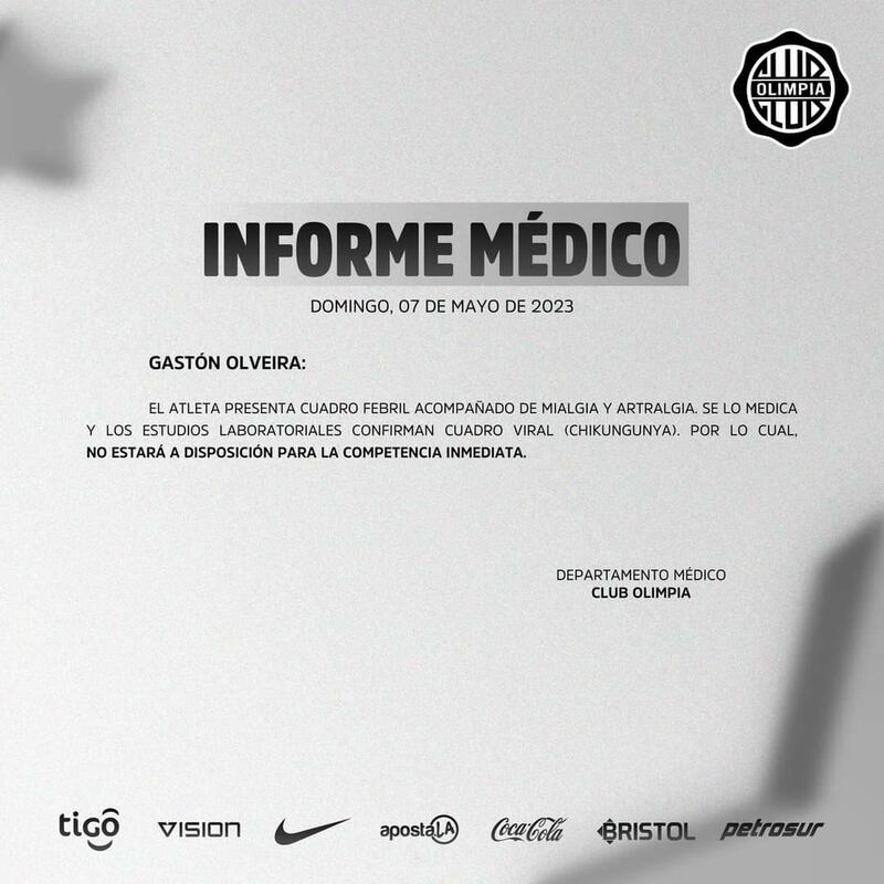 El jugador tiene un cuadro febril y manifiesta síntomas de Chikungunya, por lo que automáticamente quedó al margen del plantel y del juego de esta noche en Villarrica.