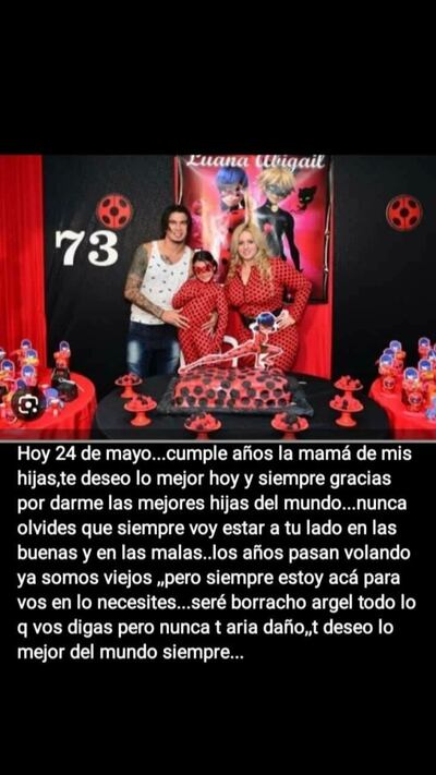 "Hoy, 24 de mayo, cumple años la mamá de mis hijas. Te deseo lo mejor hoy y siempre. Gracias por darme las mejores hijas del mundo. Nunca olvides que siempre voy a estar a tu lado en las buenas y en las malas", dice parte de la publicación de Lazaga y continuó: "Los años pasan volando, ya somos viejos, pero siempre estoy acá para vos en lo que necesites. Seré borracho argel, todo lo que vos digas, pero nunca te haría daño. Te deseo lo mejor del mundo, siempre".