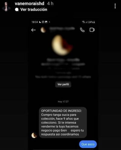 "Compro tanga sucia para colección, hace 9 años que colecciono", le ensoquetó el ñato en cuestión, por lo que la cuerona compartió en seco voi el chat en sus historias del Instagram.