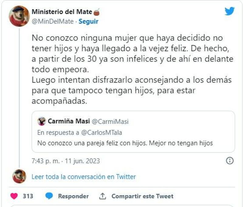 "Consejo que nadie me pidió: no sean padres de viejos; cuesta demasiado y perdemos el control. Si quieren hijos ténganlos en su mejor momento de juventud y vitalidad. La crianza está cada día más difícil. Listo, lo dije", escribió la usuaria de Twitter identificada como Jaz y Carmiña agregó: "Otro consejo: no tengan hijos".
