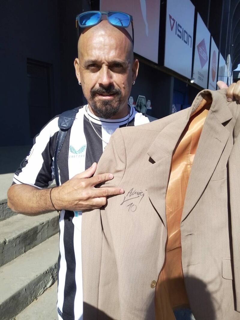 En esa visita, Almirón, entre risas y a modo de broma, recordó el saco que le había prestado "Pelado". "Acá tengo. Te voy a traer", le dijo cuando preguntó por el traje. "Mejor no, dejá nomás", le dijo el jugador riéndose.