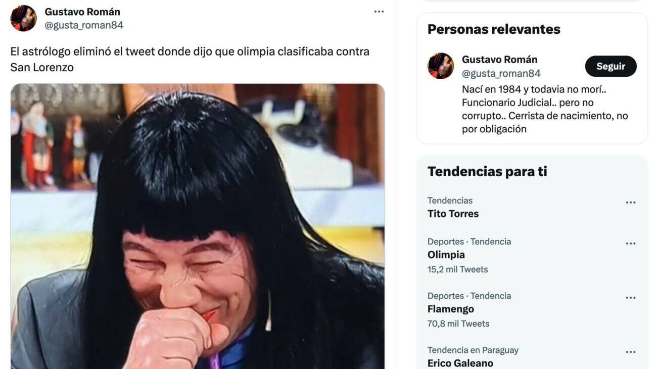 ¿Qué fue lo que pasó? ¿Se esfumó? ¿Es todo invento de la gente? ¿O realmente un “astrólogo” dijo que Olimpia clasificaba en la Copa Paraguay dejando por el camino a San Lorenzo? Sea como sea, en las redes sociales se levantó una polvareda de aquellas no solo porque el “Rayadito” le hizo comer hule al “Rey de Copas” sino porque después el tuit en cuestión, misteriosamente, desapareció como por arte de magia.