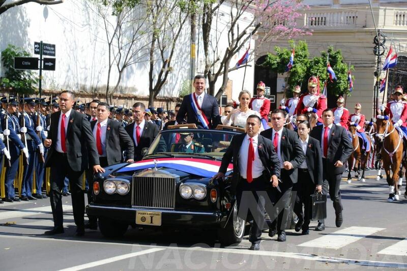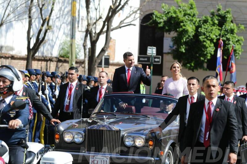 Momento en el que el vicepresidente electo Pedro Alliana, junto a su señora esposa, la diputada Fabiana Souto, se trasladan desde el Palacio de los López hasta la Catedral para la celebración religiosa. El auto es un Rolls Royce bien pituco. (Foto: Nación Media)